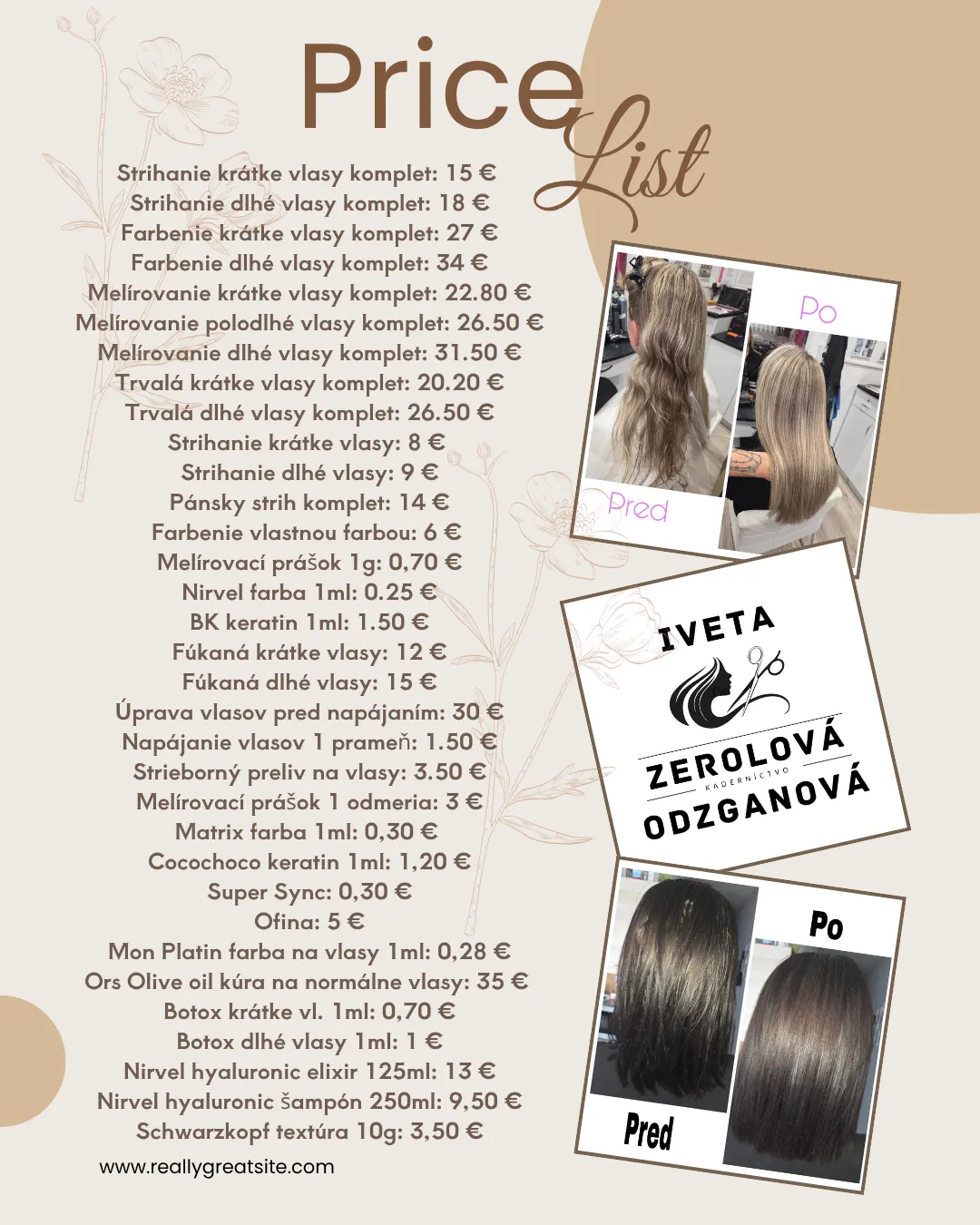 Chcete zdravé, lesklé a upraviteľné vlasy každý deň? Moja profesionálna starostlivosť v [názov salónu] je navrhnutá tak, aby každý klient odchádzal spokojný a s vlasmi, ktoré vyzerajú úžasne.